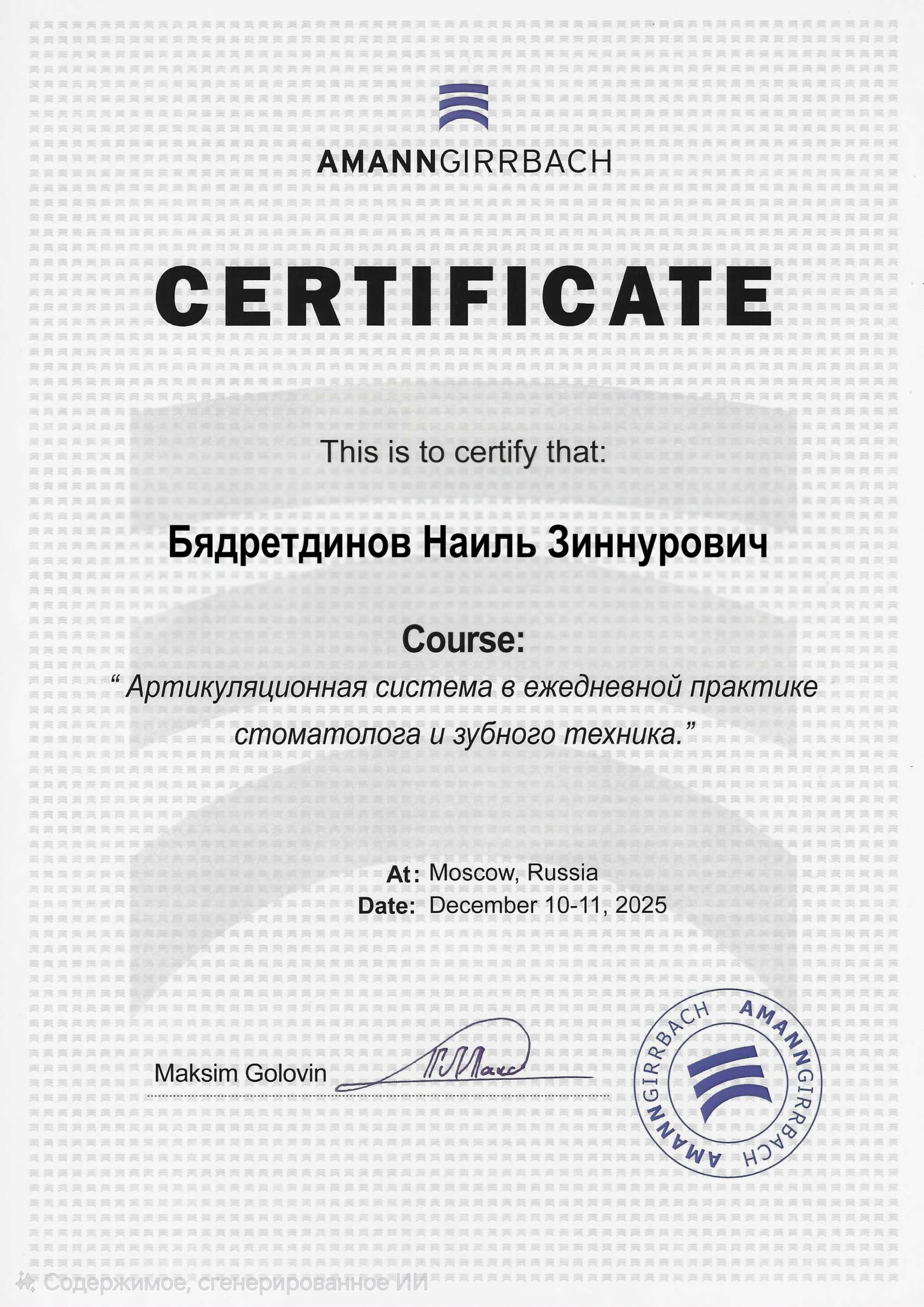 Специализация: ортопедическая стоматология.